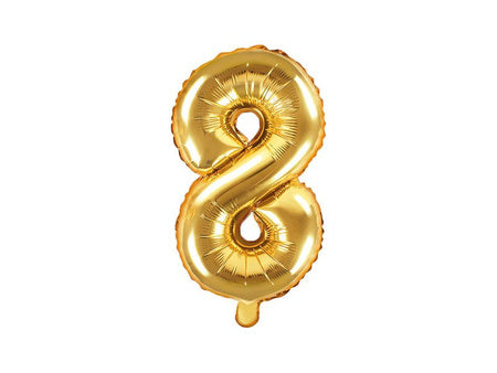 Zlat folijski balon v obliki številke 8, velikosti približno 35 cm, s posebnimi zavihki za enostavno obešanje, primeren za mostojno napihovanje.