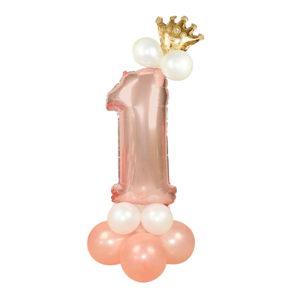 Ballon-Set für den 1. Geburtstag, Rosa-Gold. Enthält Ballons, Zahl 1, Krone, Klebepunkte & Band. Fertiges Komplettset für einfache Partydekoration.