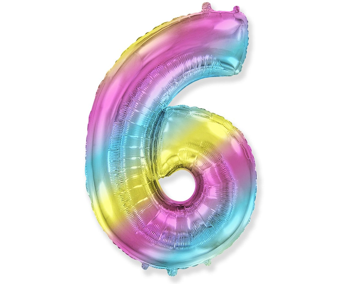 Pastellfarbener Folienballon in Zahl 6, 85 cm, mit sanftem Farbverlauf. Befüllbar mit Helium oder Luft – perfekt für Geburtstagsfeiern & festliche Dekoration.