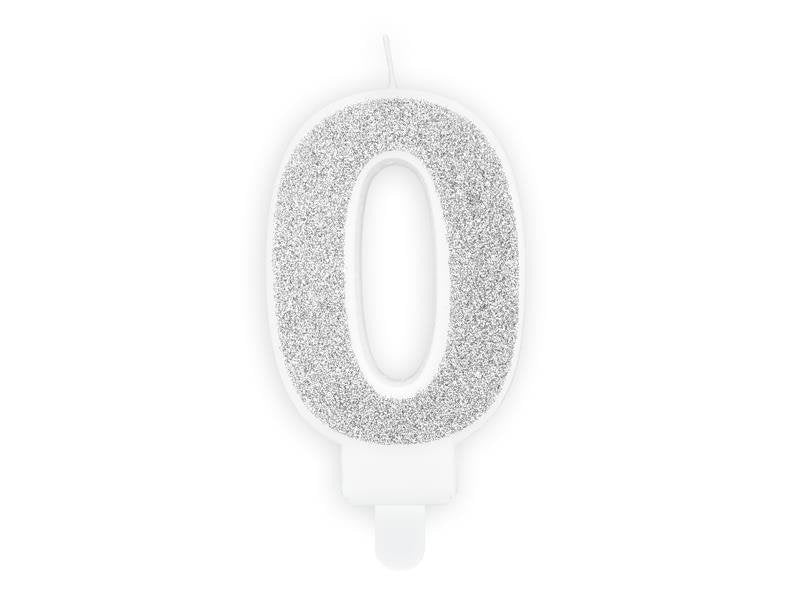 Geburtstagskerze Zahl 0, Silber mit Glitzer – 7 cm Dekokerze