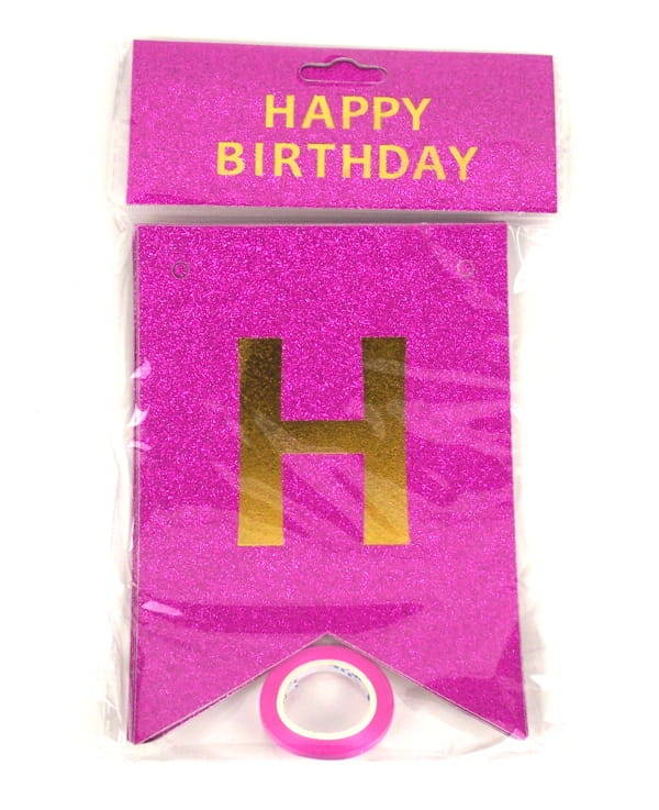Hängender „Happy Birthday“-Schriftzug in Fuchsia, 250 cm lang. Perfekt für Geburtstagsdekorationen – einfach aufzuhängen und feierlich zu gestalten.