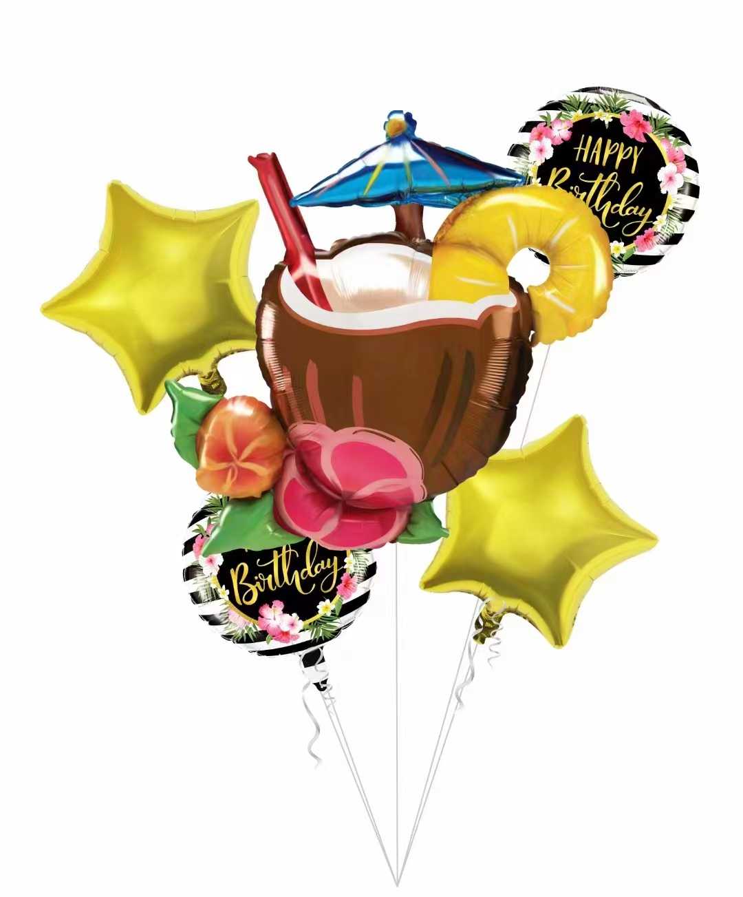 5-teiliges Kokos-Ballon-Set: 1 Folienballon Kokos, 2 Sternballons 45 cm, 2 runde „Happy Birthday“-Ballons 45 cm. Mit Helium oder Luft befüllbar....