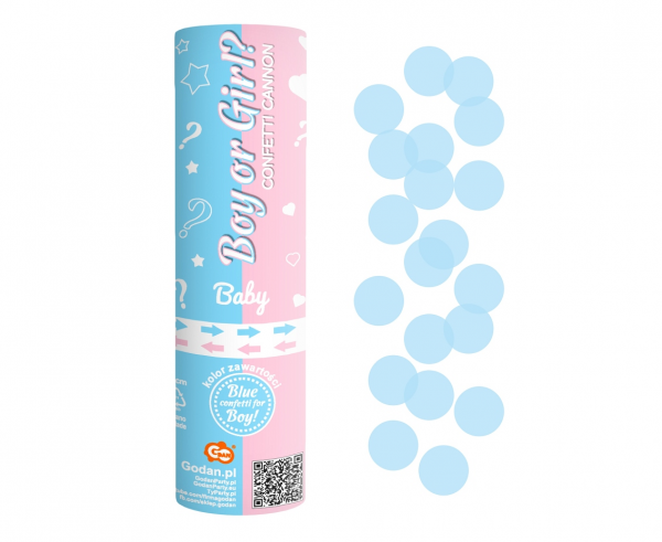 Konfetti-Kanone, 16 cm, verschießt blaue Papierkonfetti. Perfekt für Baby Shower, Geschlechtsenthüllung oder Partys. Einfach zu bedienen und für unvergessliche Momente.