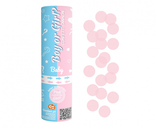 Rosa Konfettikanone für Gender Reveal oder Baby Shower. Schießt pink oder blaue Papierkonfetti und sorgt für eine festliche Überraschung.