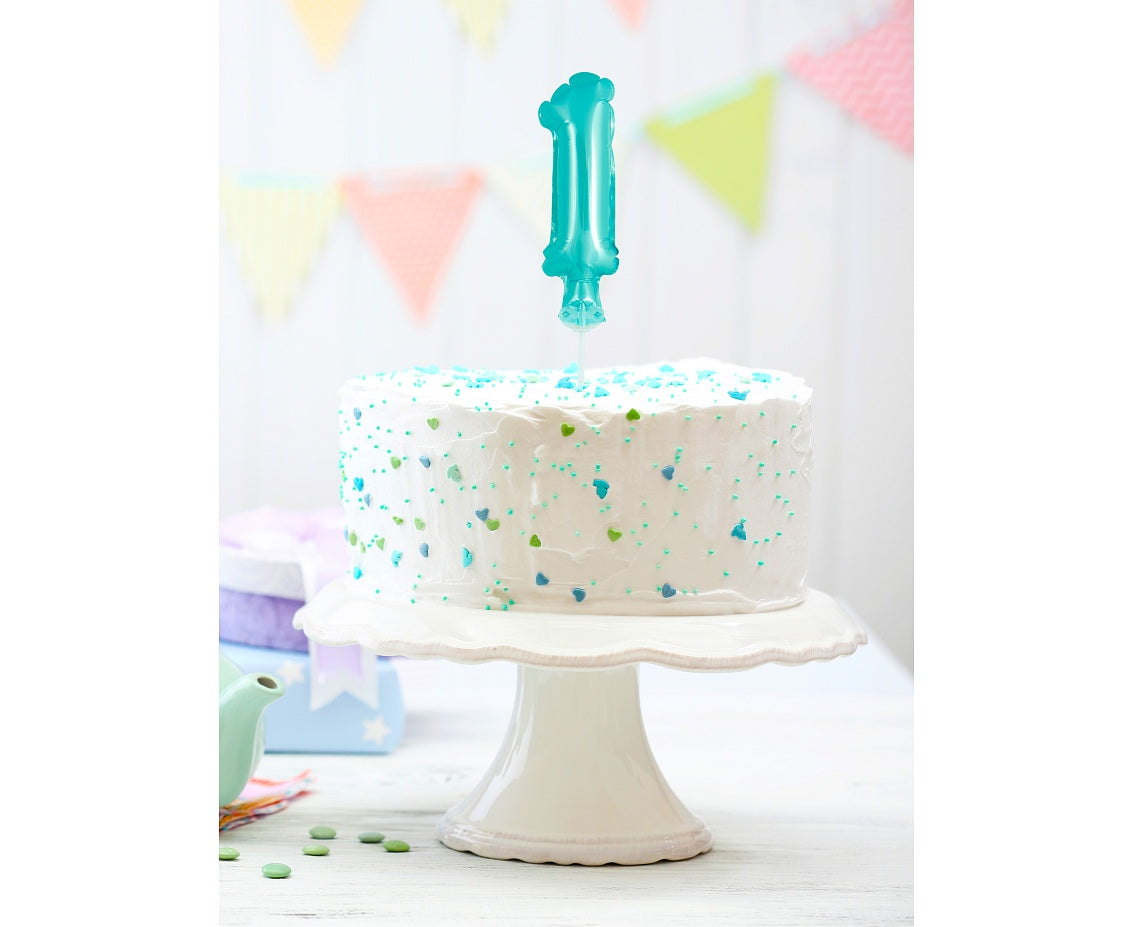 Kleiner Folienballon in Blau mit Zahl 1 auf praktischem Haltestab. Perfekt als Tischdeko oder Geschenk für den 1. Geburtstag. Nur mit Luft befüllbar, Größe 13 cm.