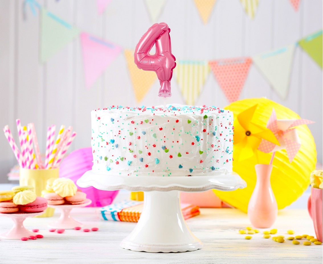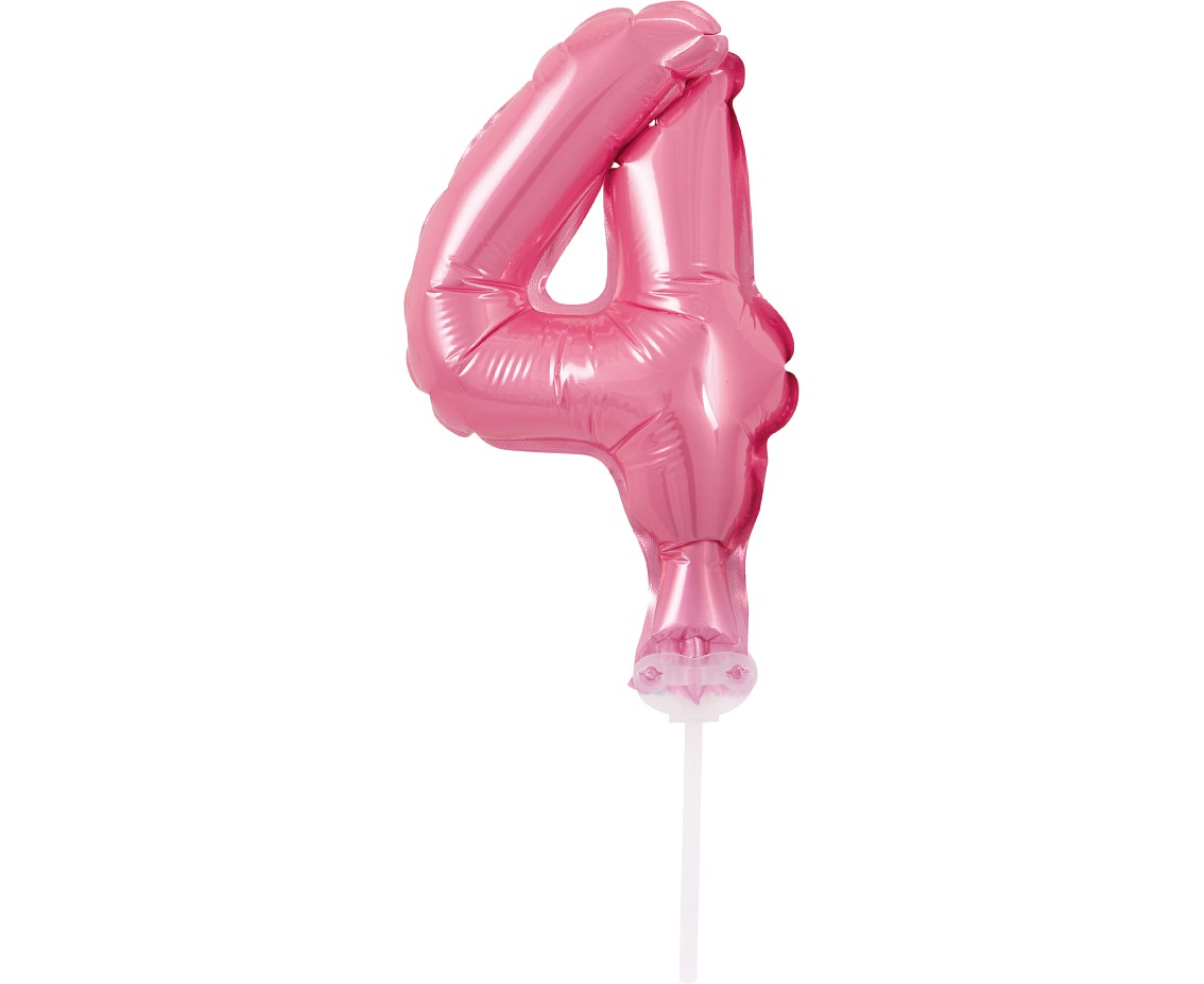 Kleiner Folienballon in Rosa mit Zahl 4 auf praktischer Haltestab-Stütze. Perfekt als Tischdeko oder Geschenk für den 4. Geburtstag. Nur mit Luft befüllen, Größe 13 cm.