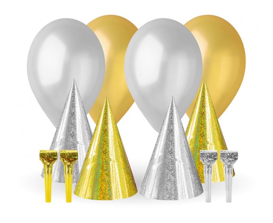 Party-Set Silber-Gold – 12 Teile, Partyhüte, Ballons & Tröten